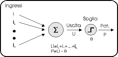Figura 6. Il potenziale P del PE è una funzione f della somma pesata degli ingressi ik comparata con la soglia q.