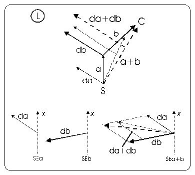 The left square of the figure 3 shows a simple path which connects the starting point S to the current one C with two vectors a, b. Since I am considering time as discrete, at each instant t the path can be represented as a vector, whose direction is the direction of the path and whose modulus is the speed in that instant. To simplify the exposure, now the speed is supposed to be the same at each instant. The bottom side of the left square shows the direction of the light source with respect to the egocentric frame of reference x, that is from the agent’s point of view. SEa is the direction of the light source da with respect to the egocentric frame of reference x when the direction of the agent is a, while SEb is the direction of the light source db with respect to the egocentric frame of reference x when the direction of the agent is b. Now consider Sea+b in figure 3 - left square: the vectorial sum da+db is just the direction of the light source with respect to the egocentric frame of reference x when the agent is lined up with the path connecting the starting point S with the current one C (dotted lines). This is in accord with the commutative law of the vectorial sum or parallelogram rule (see Appendix for geometrical proof).